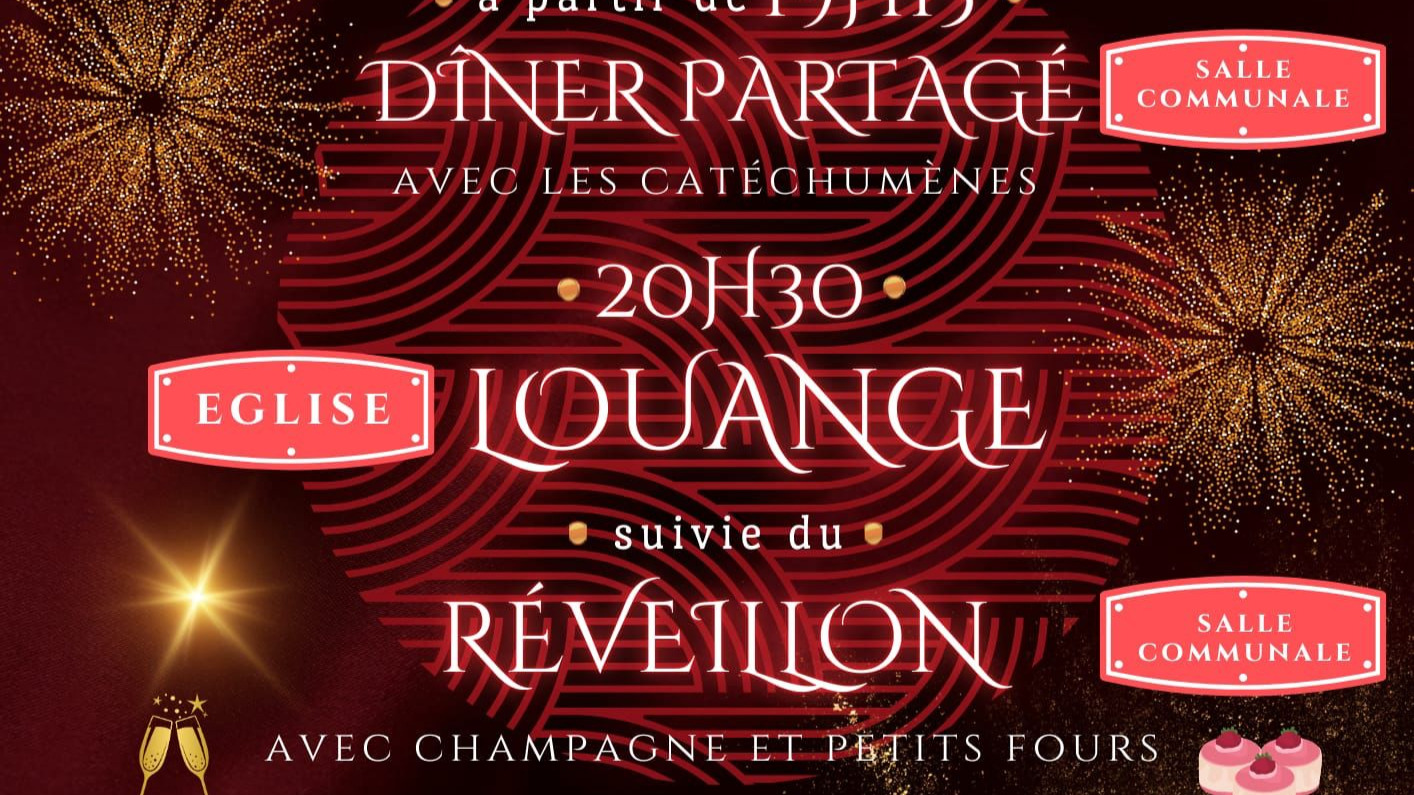 19h15 : Dîner partagé / 20h30 : Louange / Réveillon
