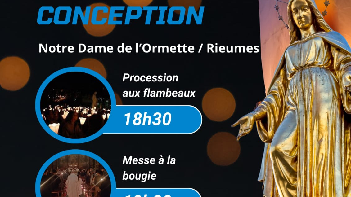 Lundi 9 décembre : procession entre l’Ormette et l’église de Rieumes à l’occasion de la fête de l Immaculée conception. 18h30 procession / 19h messe à la bougie.