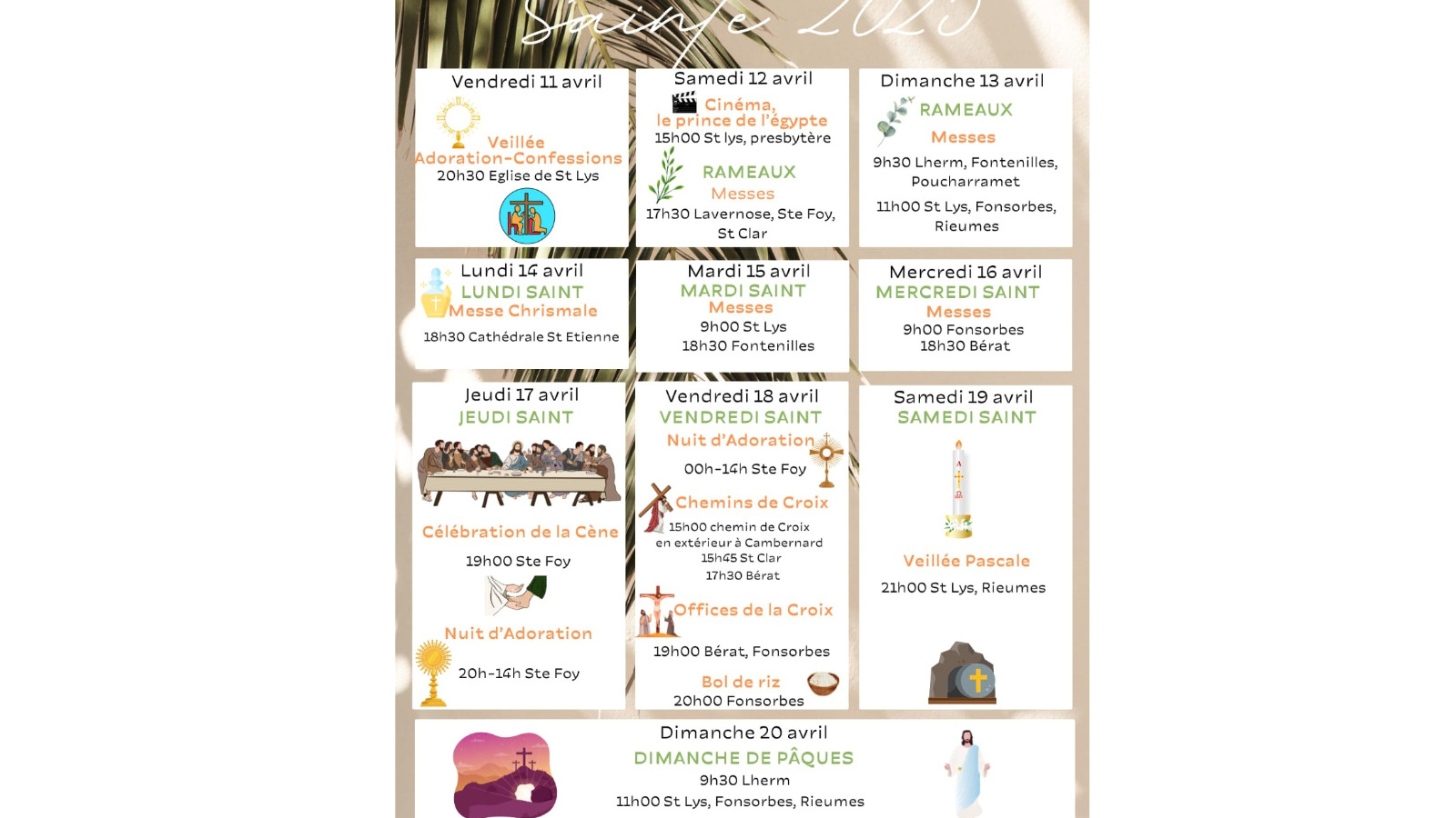 Horaires et lieux des célébrations de la Semaine Sainte et de Pâques.